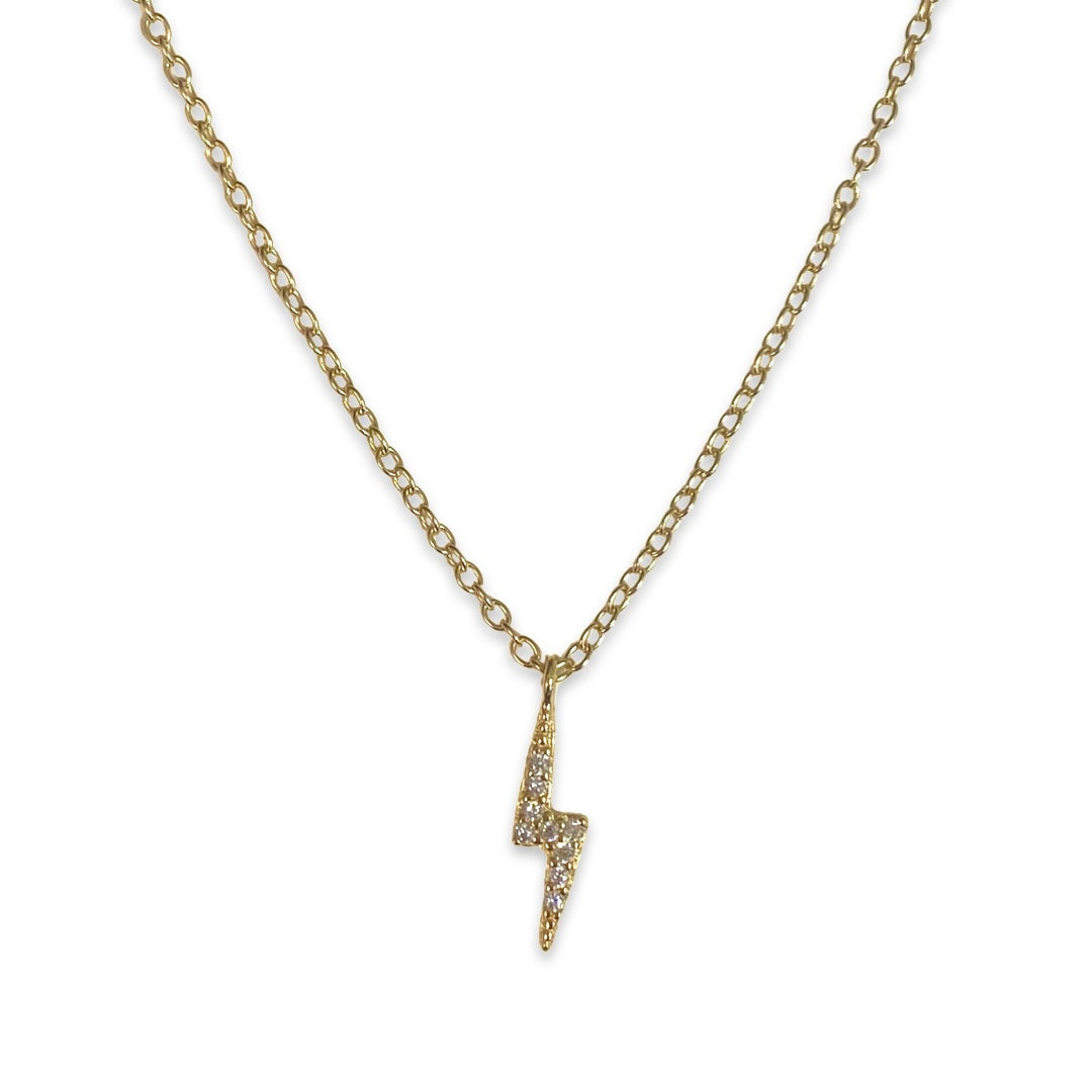 Add a darling and dainty lightning bolt necklace to your layering collection. Features a mini charm paved with sparkly clear stones. May be layered or worn solo on its own. Pair these with our lightning bolt studs for the perfect gift set. Remind her she is electric with us now.