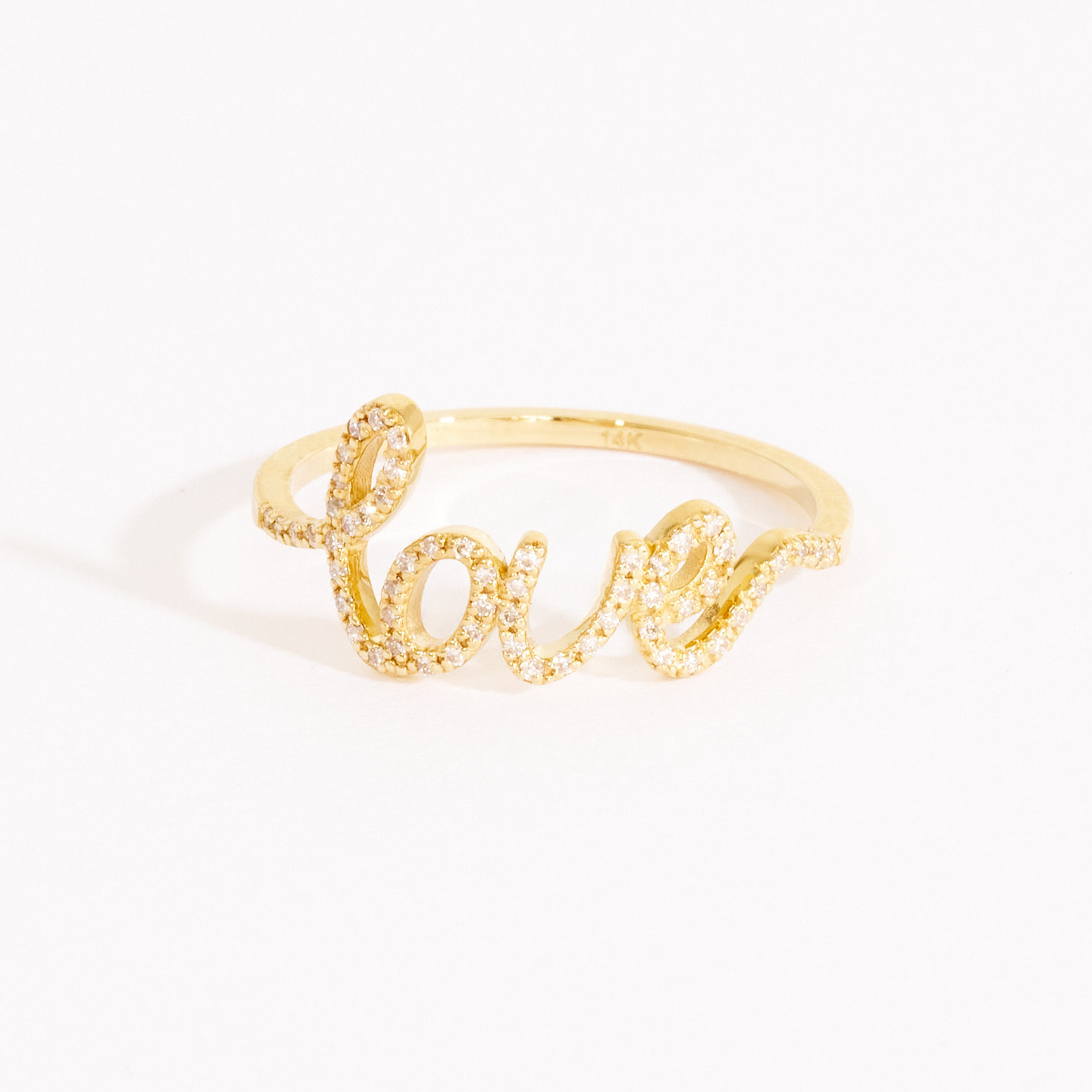 Style your fingers with a timeless statement piece that will show off your overflowing declaration of love while keeping in style. Handcrafted in 14k solid gold, the shiny band delicately flows into the cursive script 'love' that is paved in dazzling diamonds. A simple flare of sparkle when worn alone, but a worthy piece that will bring out the beauty of your everyday ring stack.