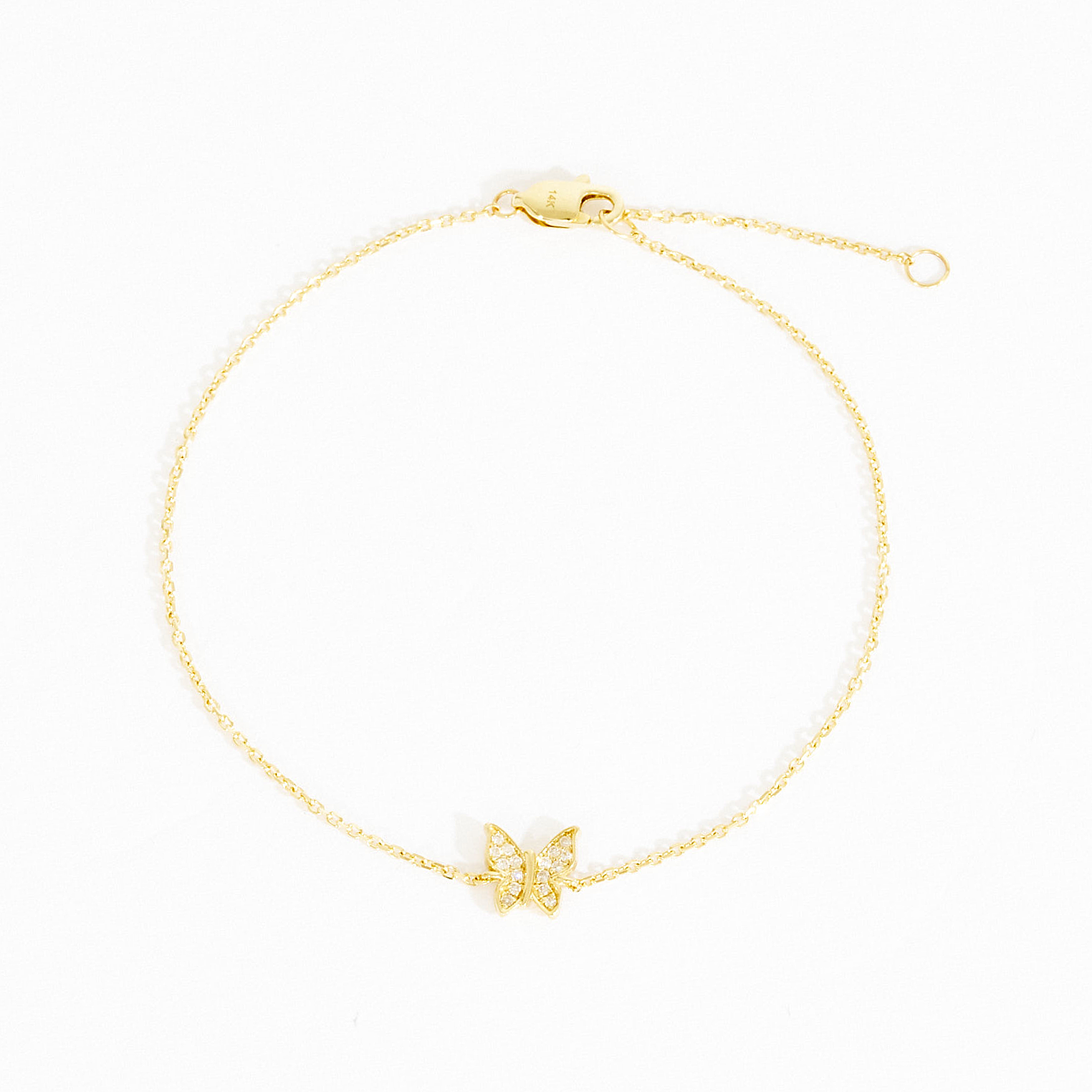 Heart-fluttering in every way and made for timeless wear. Handcrafted in 14k solid gold, the butterfly design is paved in dazzling little diamonds. A dainty and sparkling everyday bracelet that will look great stacked with other delicate bracelets or even when worn by itself.
