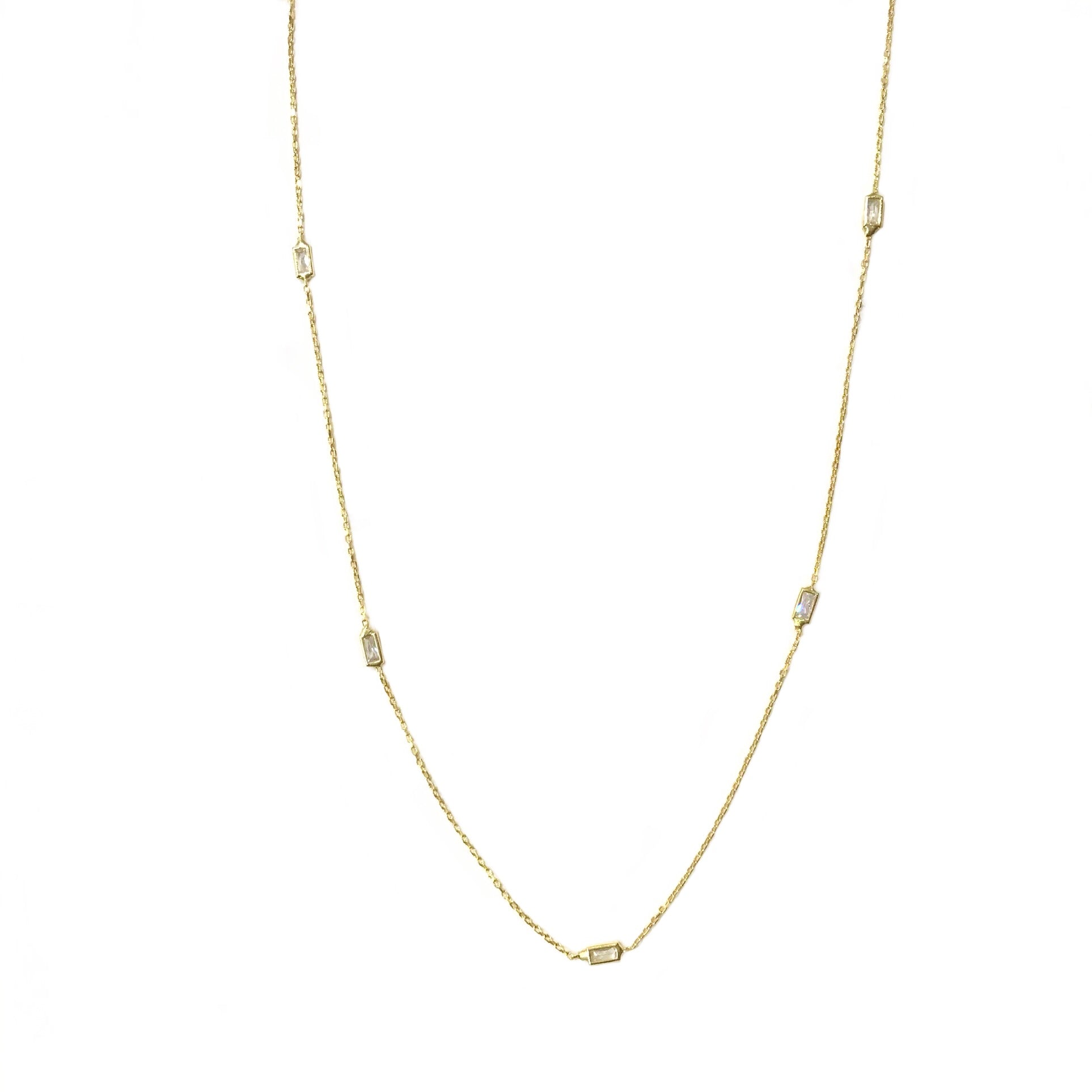 Add some charm to your outfit but adorning our dainty and classy Long Baguette Bezel Station Necklace! With baguette cubic zirconia stones stationed along the sterling silver chain, this necklace looks great with any casual or dressy outfit. Wear it by itself or add it to your special necklace layer!