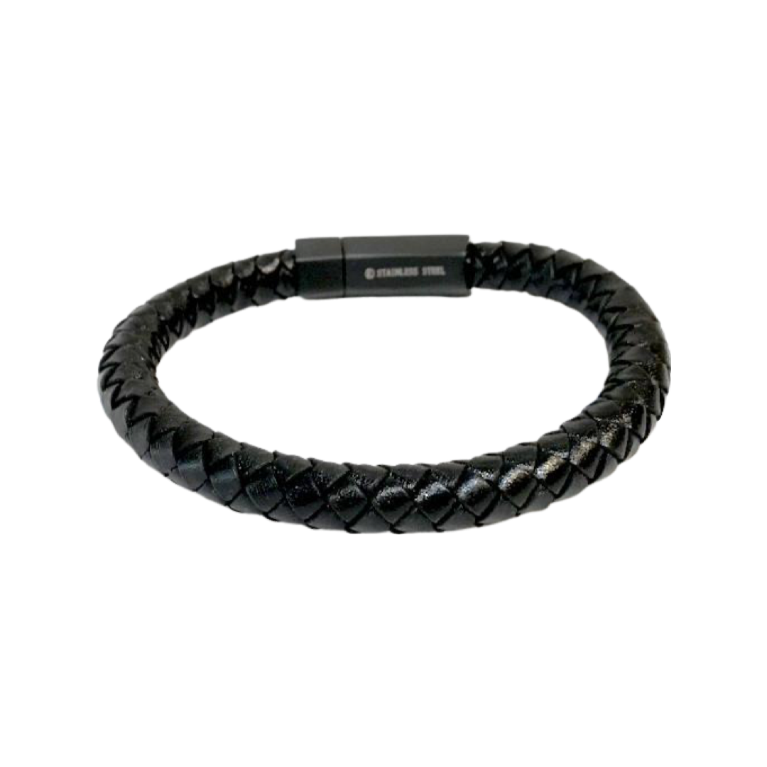 Treat yourself to our chic Men's Bracelet- braided all around in black leather. A settle look for those who just want something casual. This bracelet is secured with a magnetic clasp.