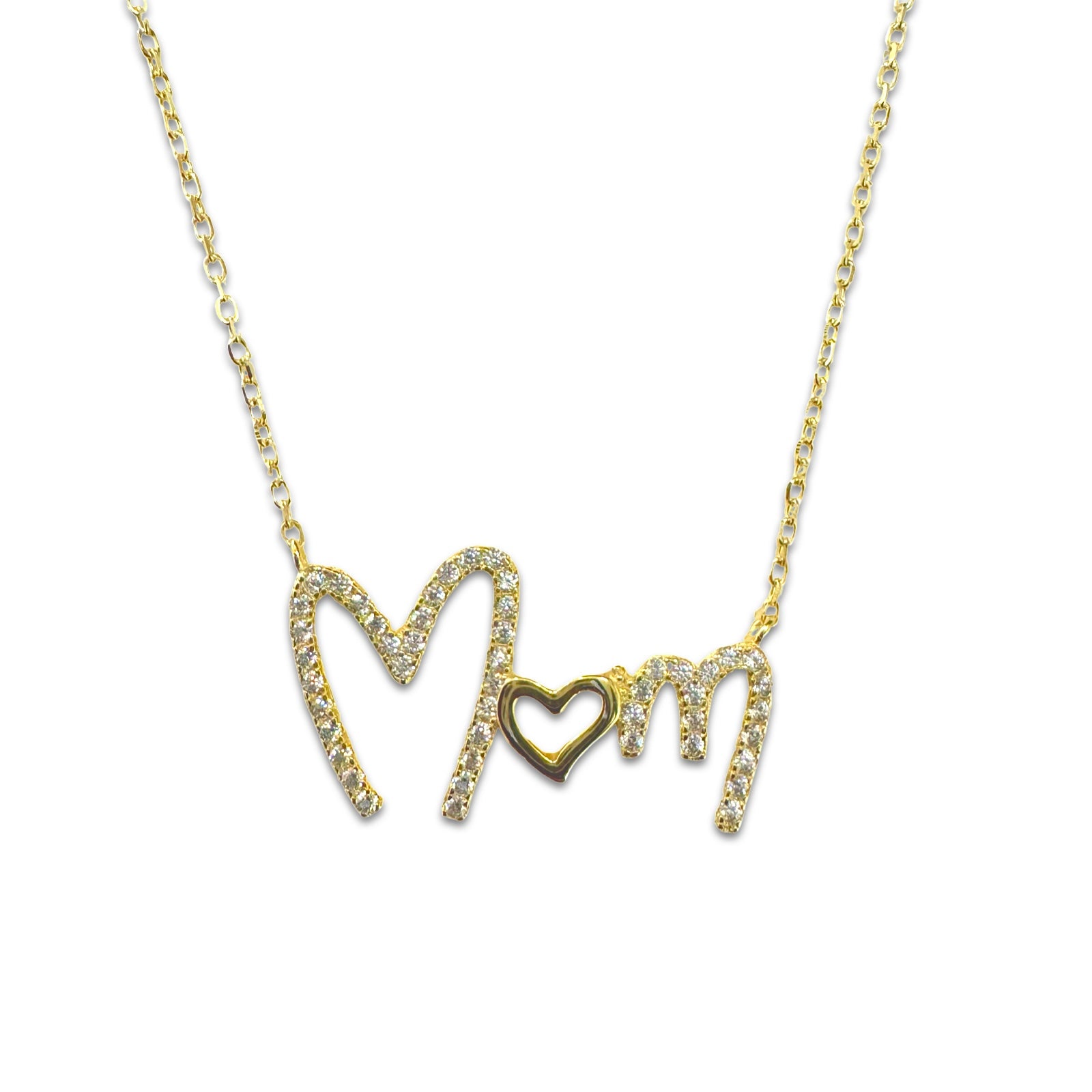 Our handwritten Mom Heart Necklace is a darling gift for any mom out there, whether for new moms, pet moms, or any moms. Features a sparkly cubic zirconia paved script M’s with a plain heart. Perfect for everyday wear, this necklace looks great worn alone or layered with other heart felt necklaces.