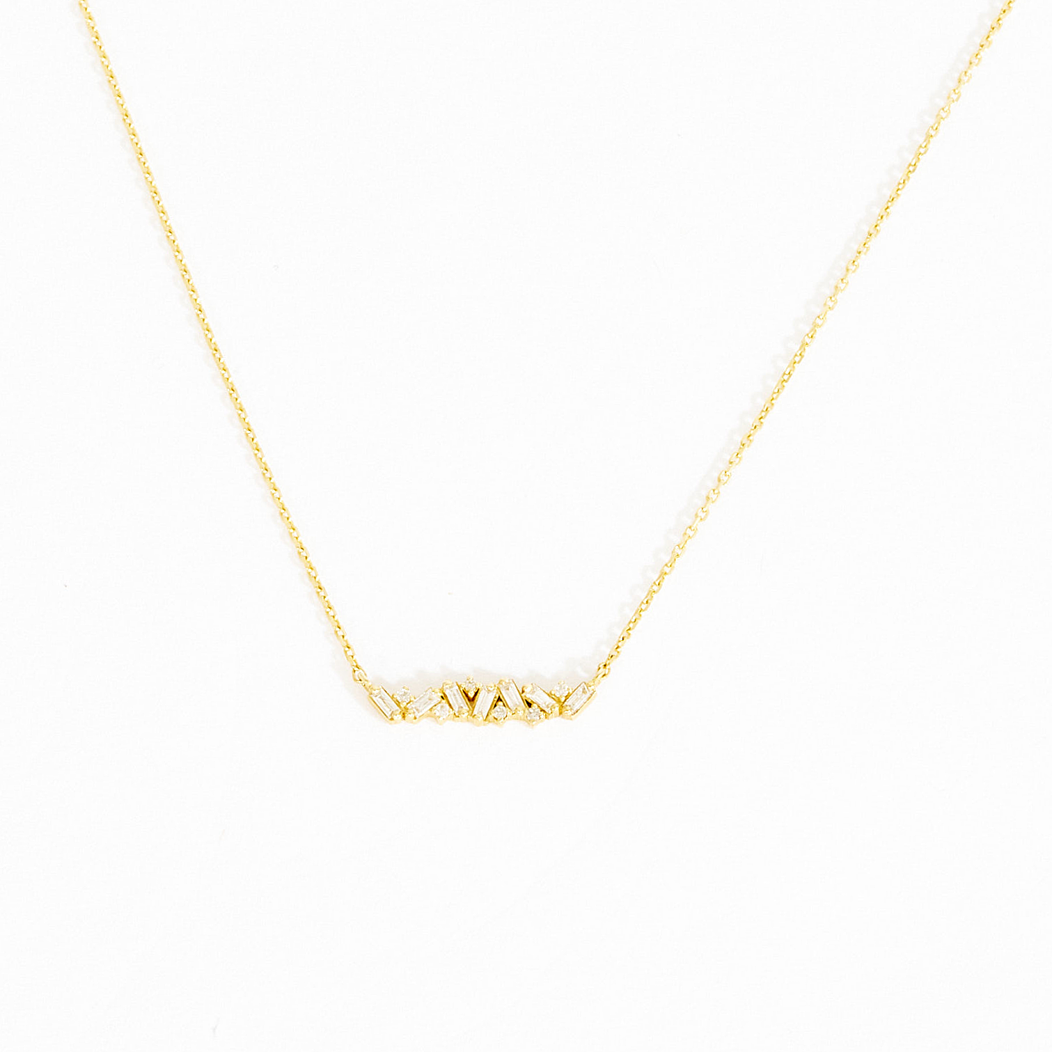 An intricate and graceful necklace made for timeless wear. Handcrafted in 14k solid gold, the dainty chain holds a sparkling design that is made up of baguette and round diamonds held together by a set of prongs to create a sparkling cluster pattern. A dainty and sparkling everyday piece that will look great layered with other delicate necklaces or even by itself.