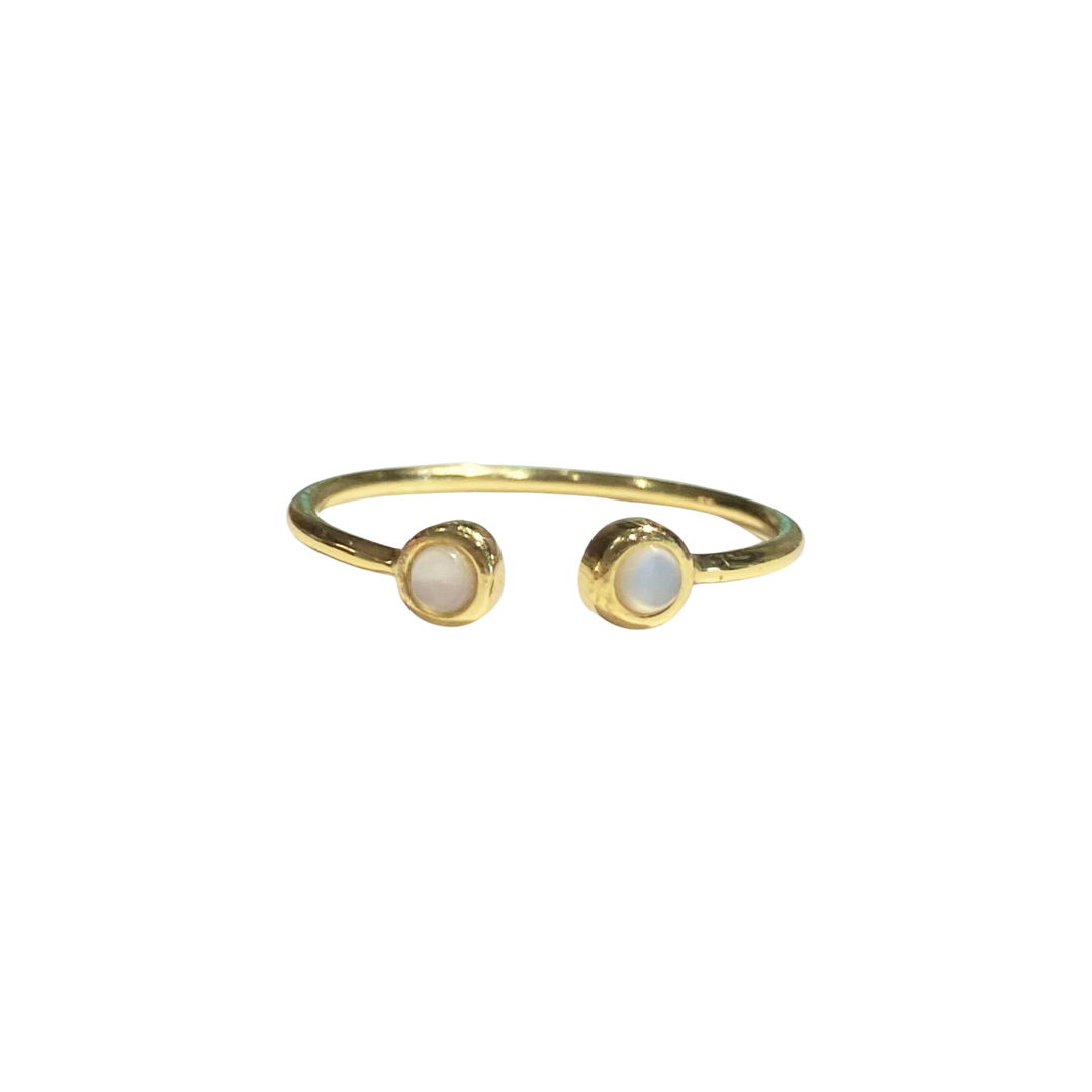 Because two gems are better than one, slide on our dainty mother of pearl ring. Features an open design that rests with two tiny mother of pearl bezels. Makes a great addition to your hand stack.