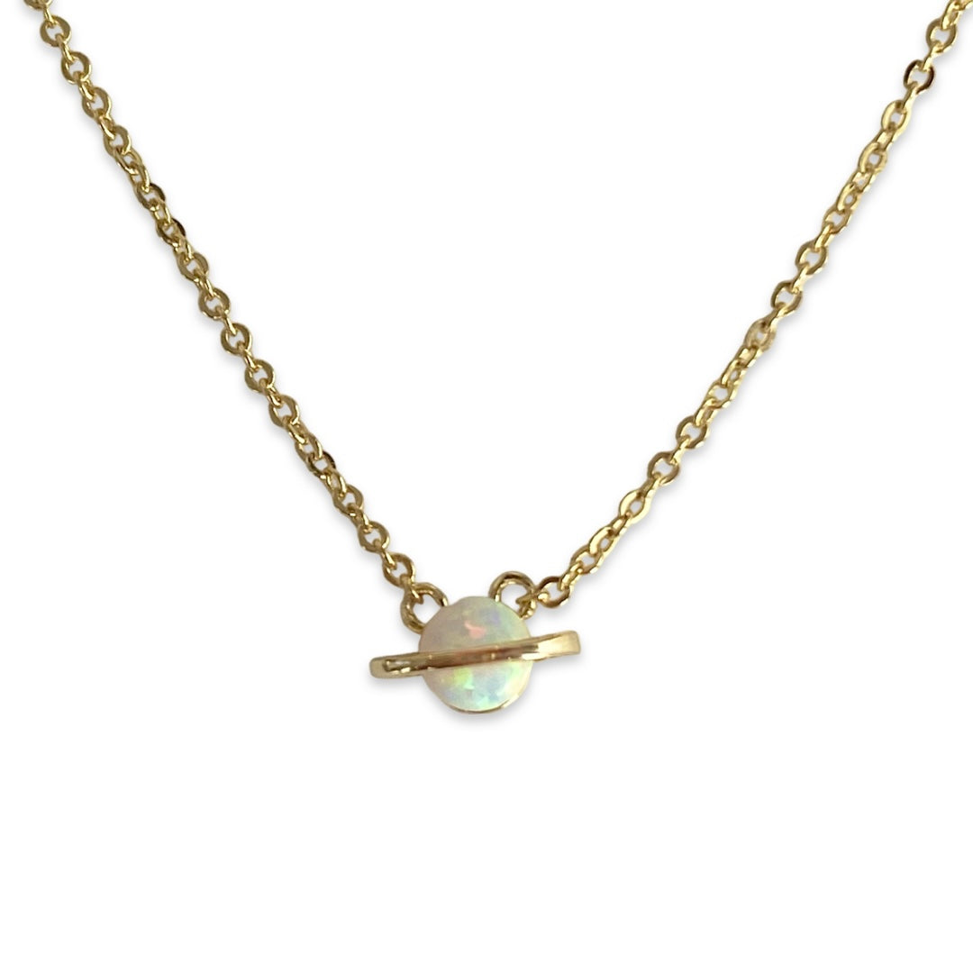 Slip on an interstellar look by adding our must have Saturn Necklace to your jewelry box today! Features a mini opal pendant charm that hangs on a delicate gold chain. Planet Saturn represents strength and organization, and is believed to bring the wearer order and structure to ones' life.