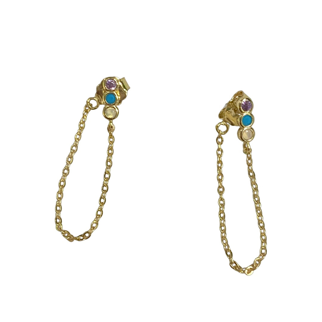 Our Bezel Chain Earrings feature 3 sparkly cubic zirconia stones that is followed by a dainty chain that falls in front and back of your ear. Simple and modern enough to wear everyday. For those with multiple holes, these look fierce when stacked with other geometric Noellery earrings.
