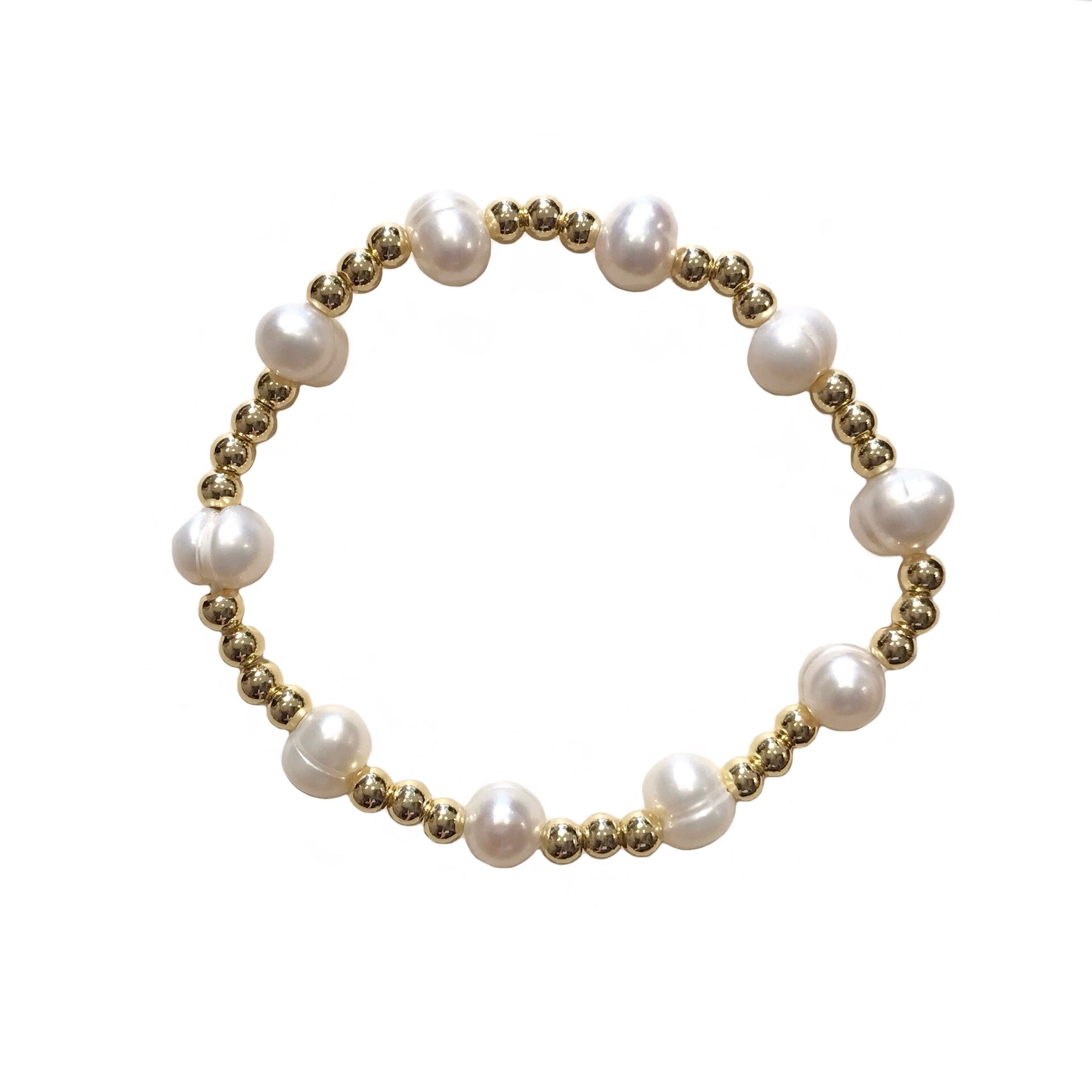 Slip on a bold string of pearls onto your wrist with us! Our Pearl Stretch Bracelet features large freshwater pearls strung securely with a mix of gold beads. May be stacked with other bracelets or worn individually on its own. Make her feel special with our Pearl Bracelet today!