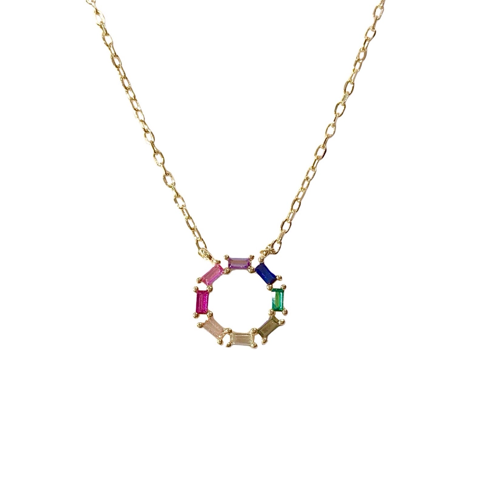 Add a swirl of color to your layer with this Rainbow Baguette Necklace! Hanging from the dainty sterling silver chain is a circle made up of multi-colored Cubi citron is stones that are held in a prong setting. Darling when worn solo or layered with other Noellery pieces. Makes a great everyday accessory that can be gifted to your loved ones or to yourself as a treat!