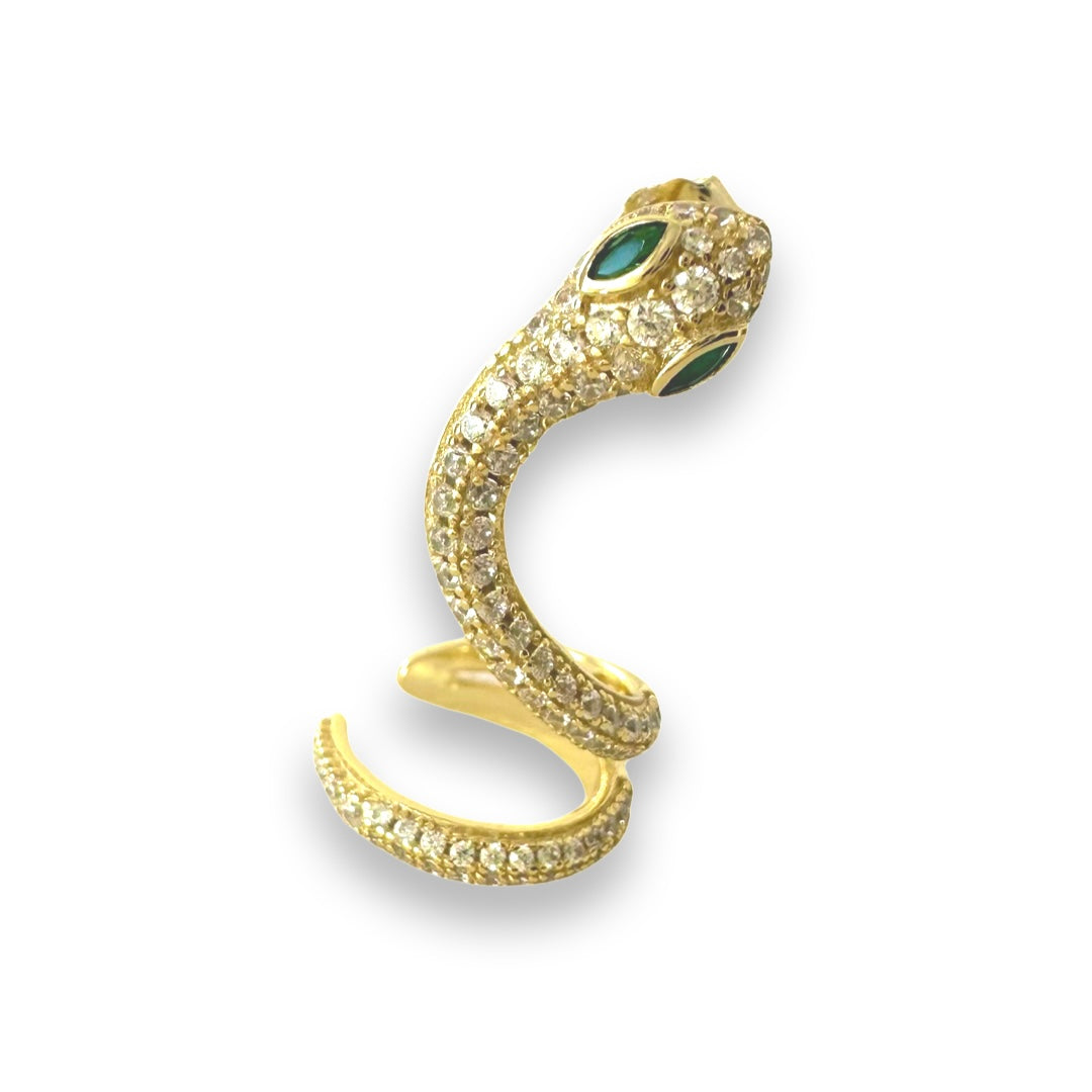 Adorn your ears with our sassy Sandy Snake Cuff Stud Earring. Features a sparkly micropave swirl of clear cubic zirconia stones in the shape of a snake with a gorgeous emerald cubic zirconia stone for the eyes. Simply slip in the post through your piercing and then twist up to pinch the end to the shell of your ear. A daring ear accessory that is perfect for everyday wear and can be stacked with other Noellery piercings for those with multiple piercings.