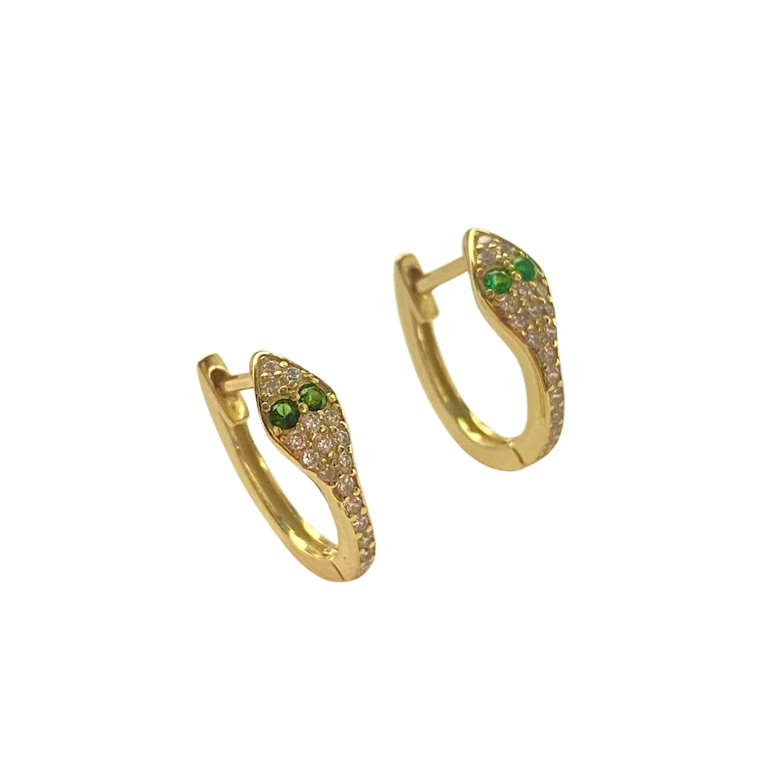Our snake huggie earrings are a must have for the trendy woman. Features a snake head with two sparkling green cubic zirconia eyes. Secures snuggly to your ear with a comforting click.