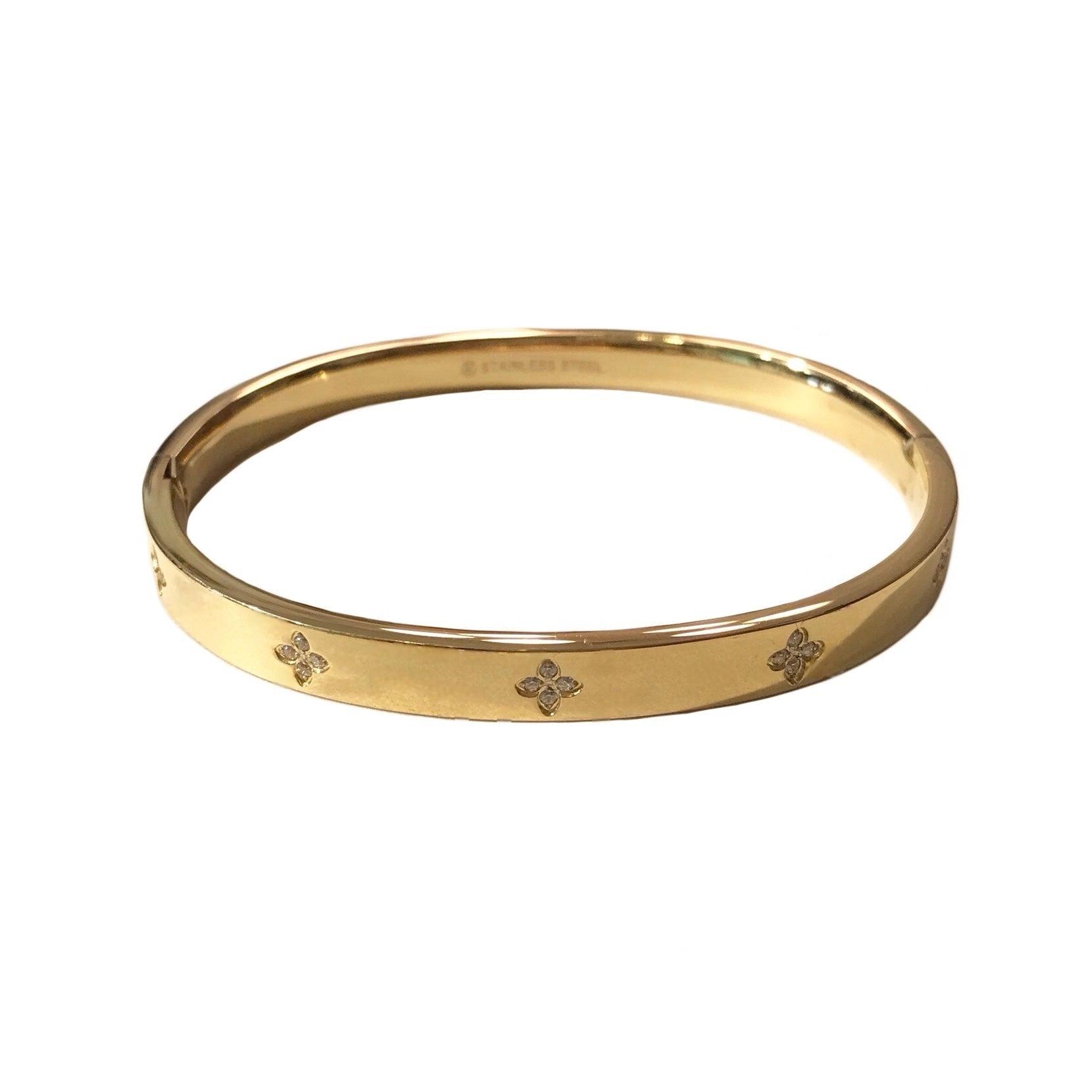Chic and modern, add our Flora Bangle to your jewelry collection today! This snap on cuff features a shiny bangle adorned with round cubic zirconia stones set in a four petal design along the front. To wear, gently push the top end up and then pull the two ends apart. Great when worn alone but can be stacked with other sparkling Noellery bracelets and bangles to add more glamour to your day!