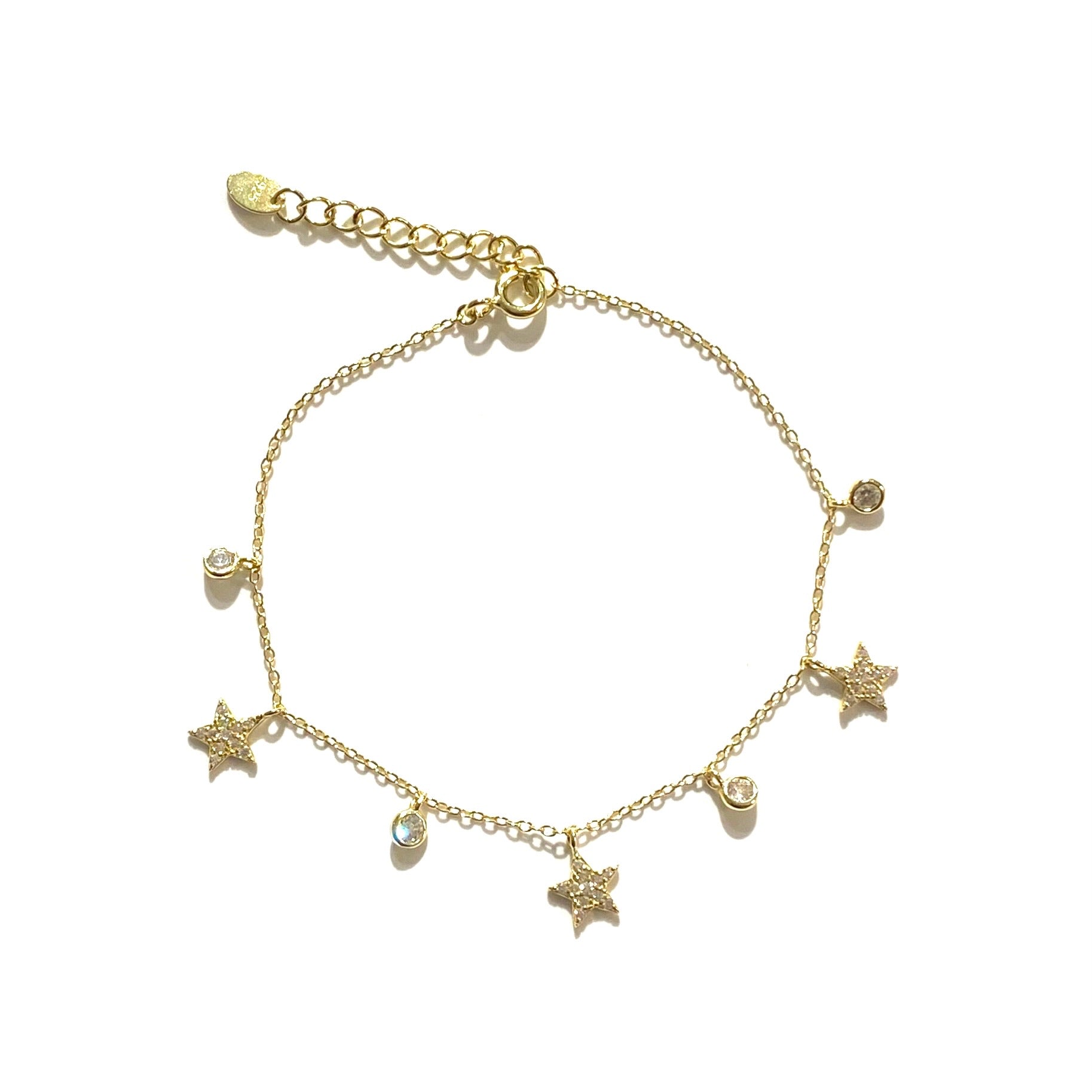 Reach for the stars with our darling star charm bracelet. Features a high polished gold chain links that dangles with paved stars. Makes a great addition to any of your layers. Layer this with our moon necklace for the ultimate celestial accessory. Makes a great gift for your loved one every occasion.