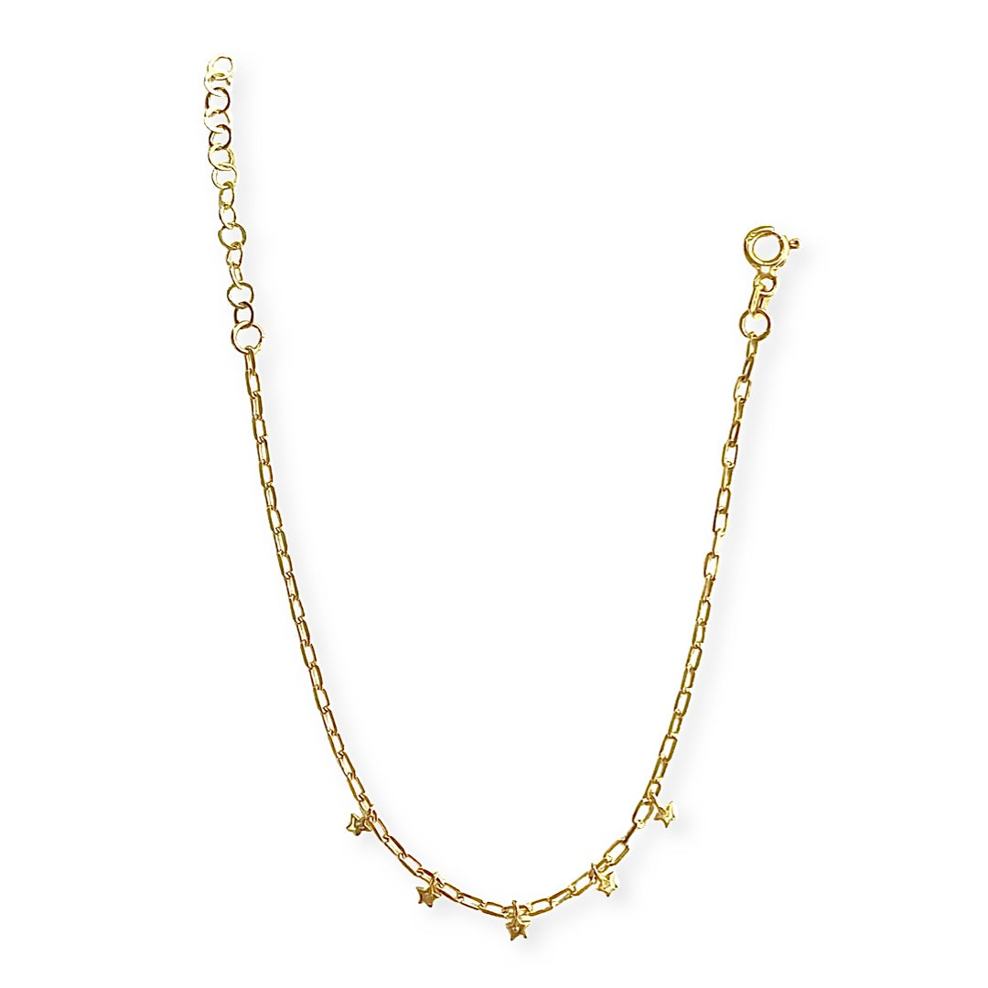 Reach for the stars with our darling star charm bracelet. Features a high polished gold chain links that dangles with tiny plain stars. Makes a great addition to any of your layers. Layer this with our moon necklace for the ultimate celestial accessory. Makes a great gift for your loved one every occasion.