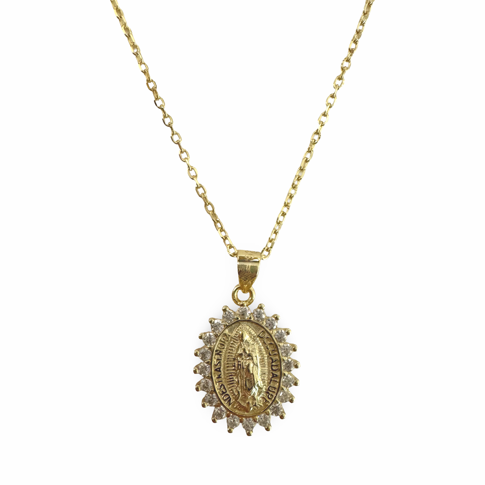 Our beautiful Guadalupe Necklace makes the perfect gift for the trendy spiritual woman! Features a St. Maria pendant that is hand chiseled with details on the front and surrounded by a halo of prong set cubic zirconia stones. This meaningful necklace can be worn alone or with other Noellery necklaces to make a wonderful layer for everyday wear.