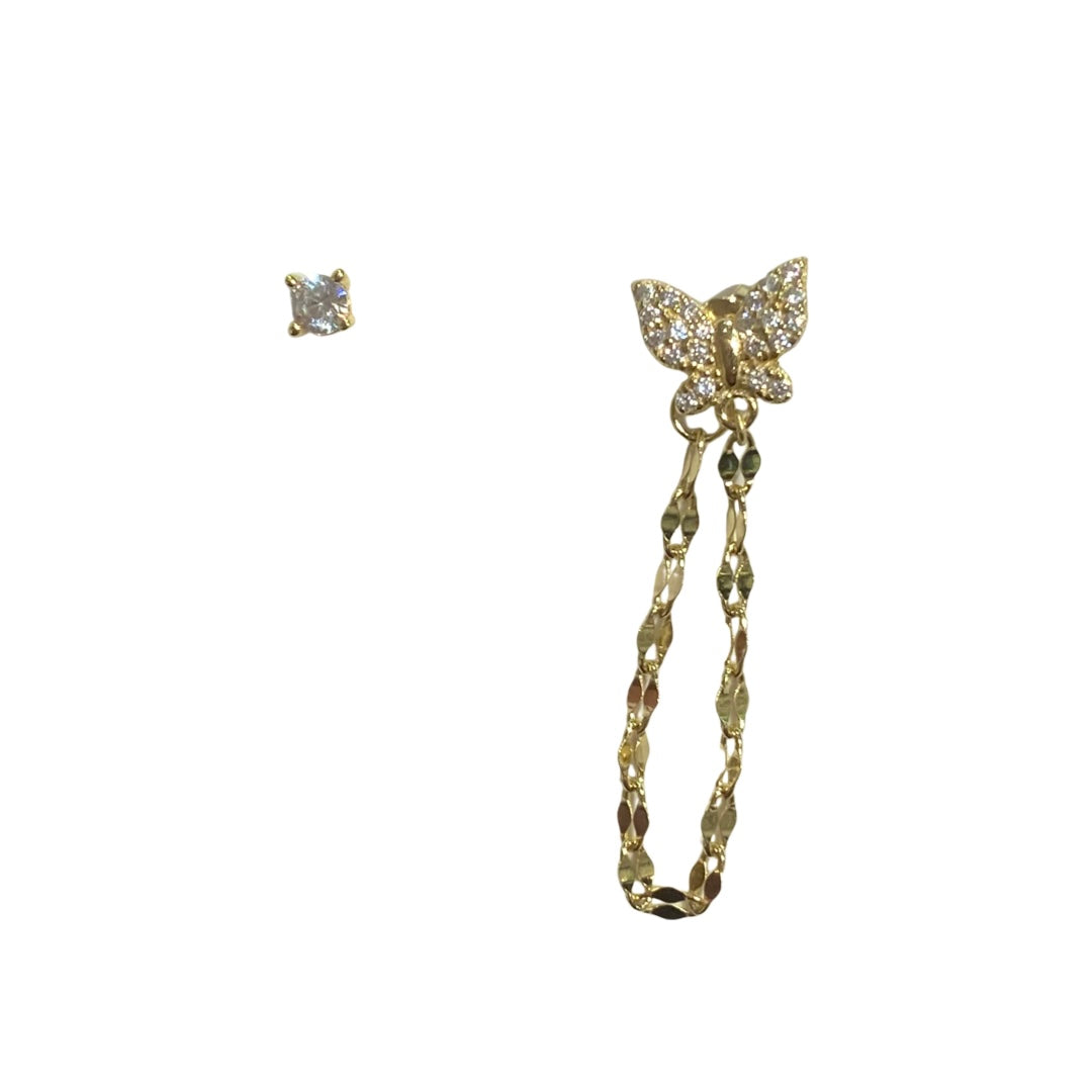 Mix it up and take flight with these dazzling Sweet Butterfly Unbalanced Earring Set! Features a single 3mm stud and a cubic zirconia paved butterfly stud with a dangling chain that loops around the front to the back of your piercing. Whether worn together on one ear or unbalanced on both ears, these sweet butterfly earring sets make the perfect everyday accessory to add sparkle to your day!