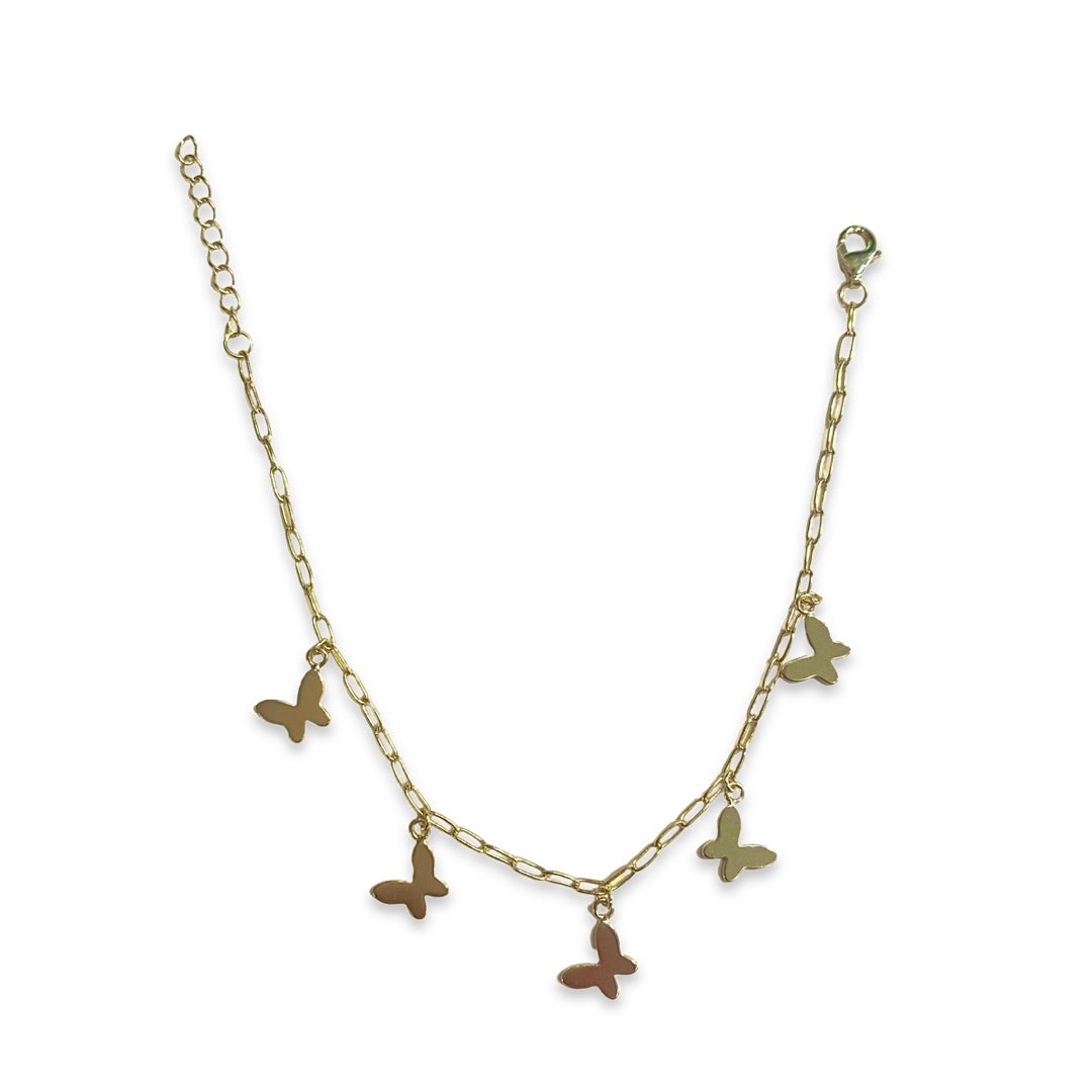 Fly away with our Butterfly Bracelet. Features 5 stations of butterfly charms that dangle on a dainty paper link chain. Butterflies represent hope, endurance, and growth. Wrap it around your wrist for some extra sparkle.