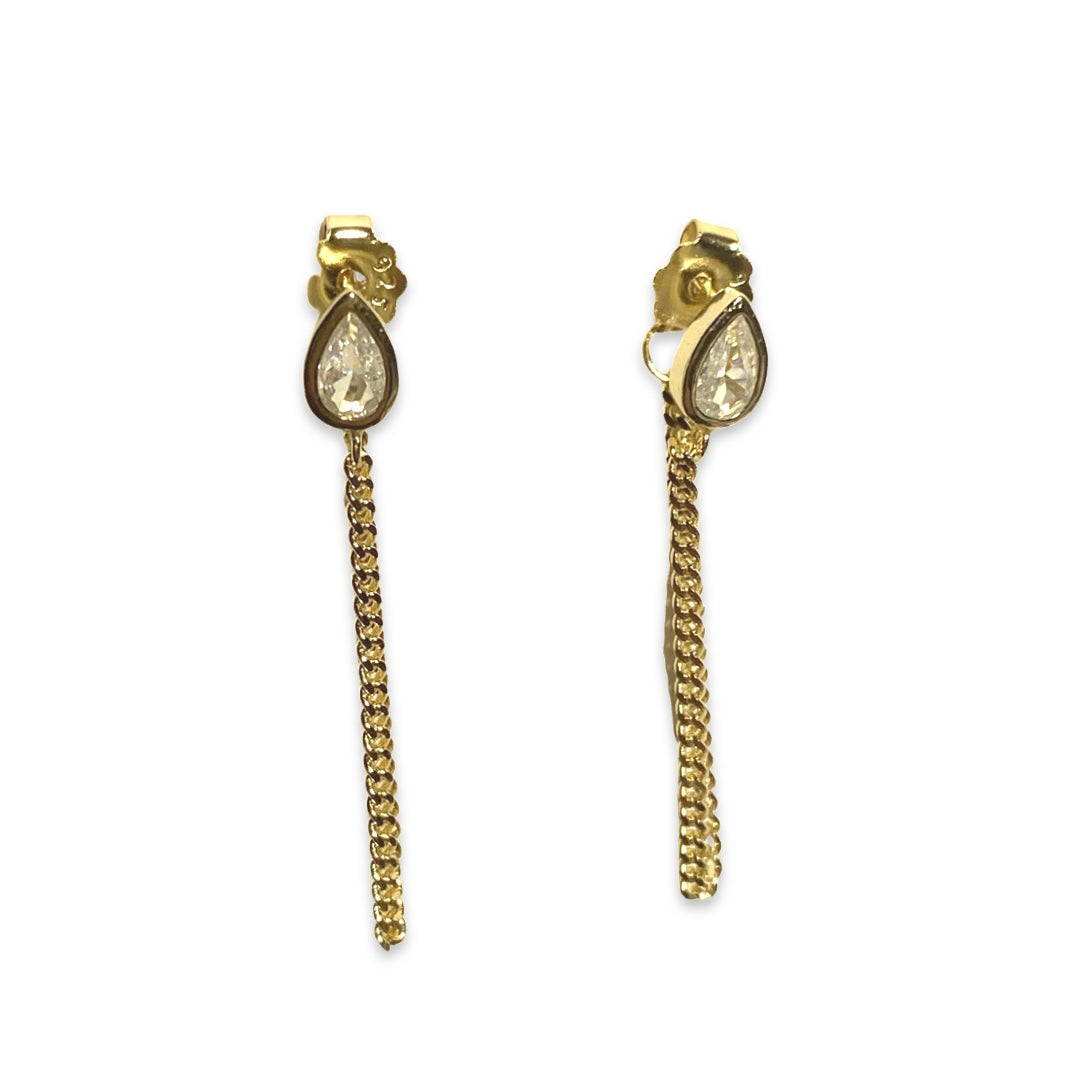 Our Amy Teardrop Chain Stud Earrings feature a sparkly teardrop shaped bezel stud that is followed by a flat cuban chain that falls in the front and back of your ear. Simple and modern enough to wear everyday. For those with multiple holes, these look fierce when stacked with other geometric Noellery earrings.