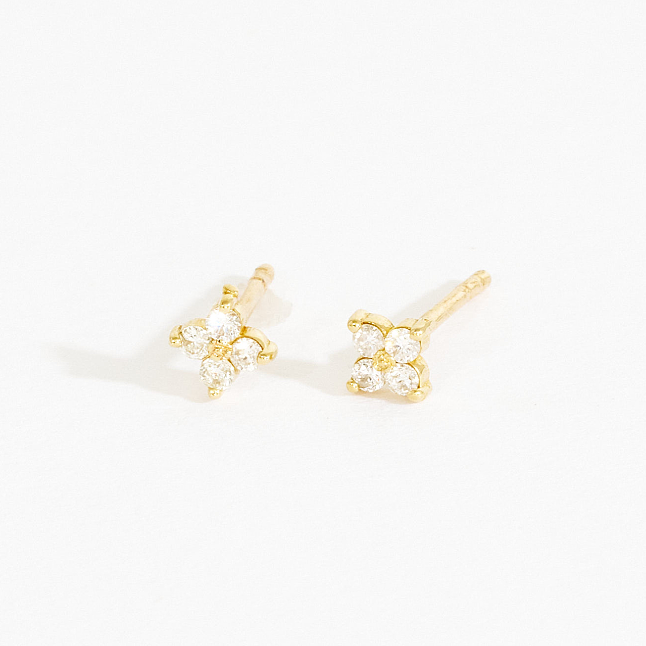 Dainty little flowers that will make heads turn your way. Handcrafted in 14k solid gold, the four diamonds are set in prongs to create a flower design. A sparkling accessory to dress up your ears, these lovely everyday studs that you can’t live without will add a charming touch to any ear stack.