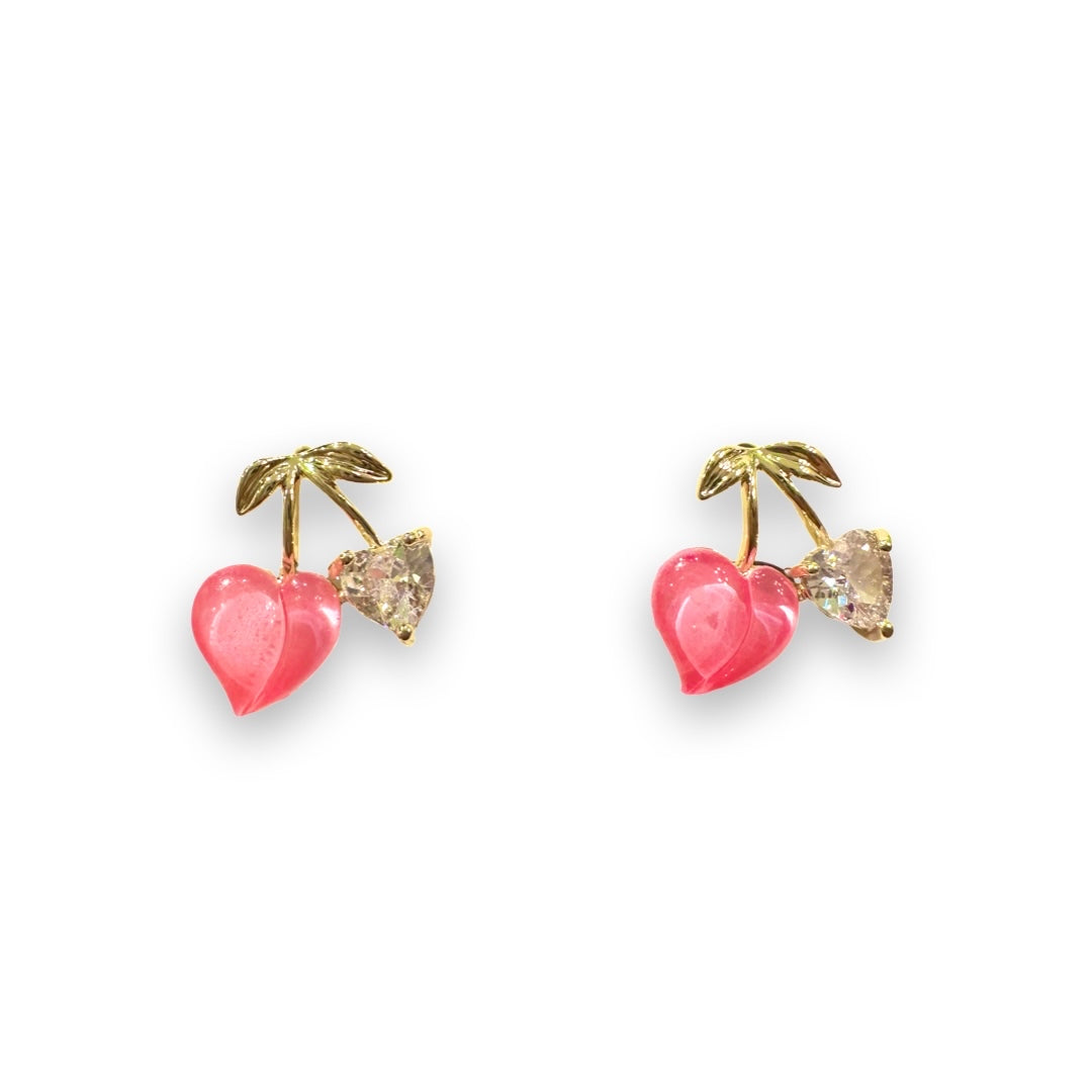 A pop of color and a touch of sweetness, throw on our Peach Cherry Studs today! Features a pink peach crystal with a clear cubic zirconia heart that are attached by a plain metal stem. Makes a perfect gift for my occasion to show off how sweet they are!